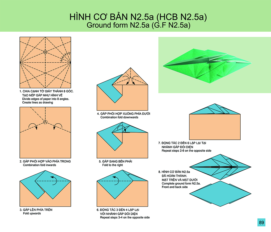 Mẫu gấp Con chó xuất phát từ Hình cơ bản N2.5a, chia cạnh tờ giấy thành 8 góc.