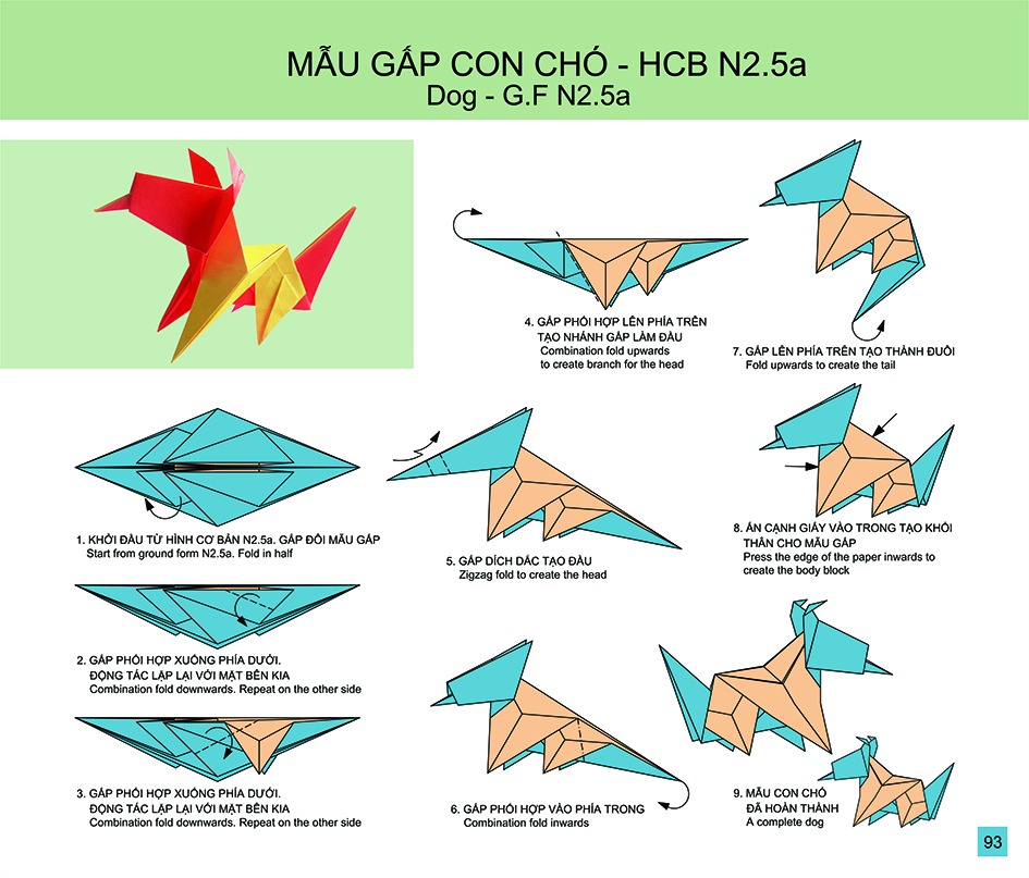 Mẫu gấp Con chó mang tính biểu tượng cao và đơn giản với 9 bước gấp (không kể Hình cơ bản).