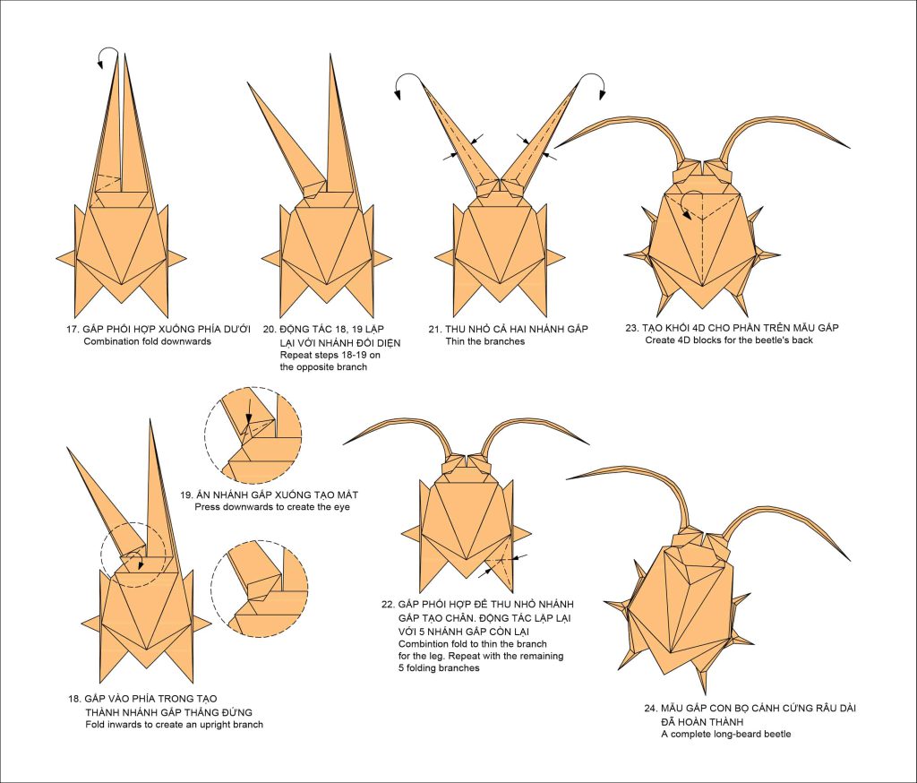 Mẫu gấp Con bọ râu dài không quá phức tạp với 24 bước gấp (không kể Hình cơ bản).