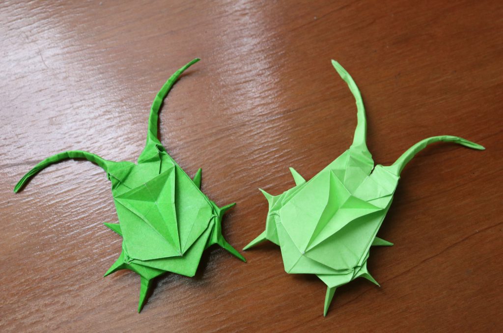 Mẫu gấp dưới đây bắt nguồn từ hình cơ bản tạo ra con bọ không chỉ có nhiều chân mà còn có râu dài.