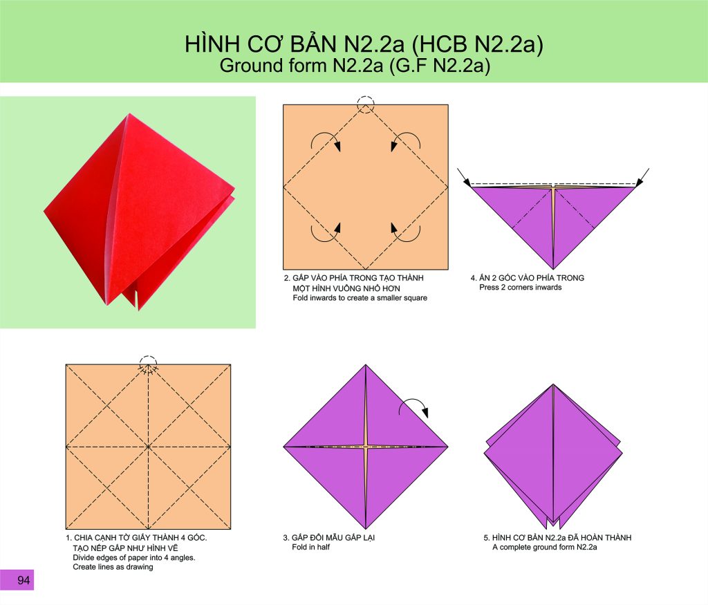 Mẫu gấp Hộp vuông M3 xuất phát từ Hình cơ bản N2.2a, chia cạnh tờ giấy thành 4 góc.