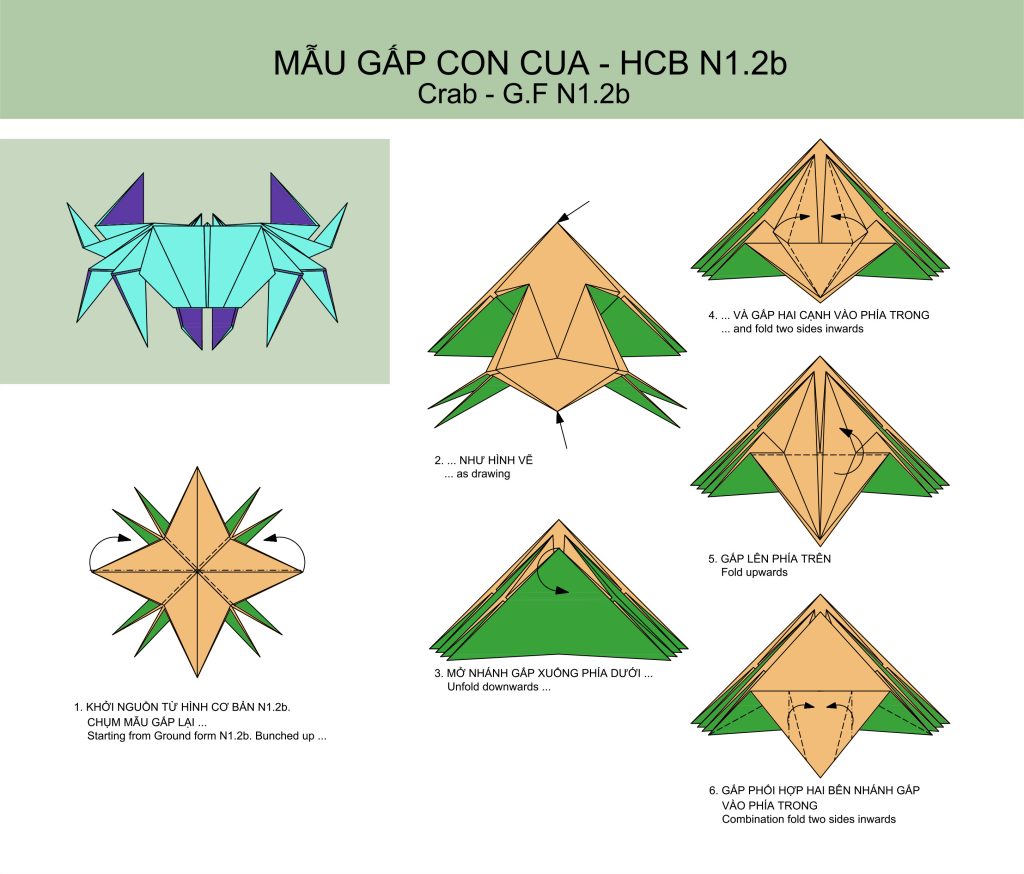 Mẫu gấp khá đơn giản, với 26 bước (không kể Hình cơ bản) tạo nên: ” Con cua 8 cẳng, 2 càng; 1 mai, 2 mắt rõ ràng con cua”.