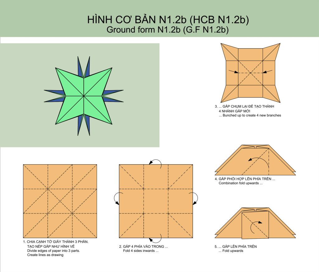 Mẫu gấp Con cua xuất phát từ Hình cơ bản N1.2b, chia cạnh tờ giấy thành 3 phần, tạo ra nhiều nhánh gấp.