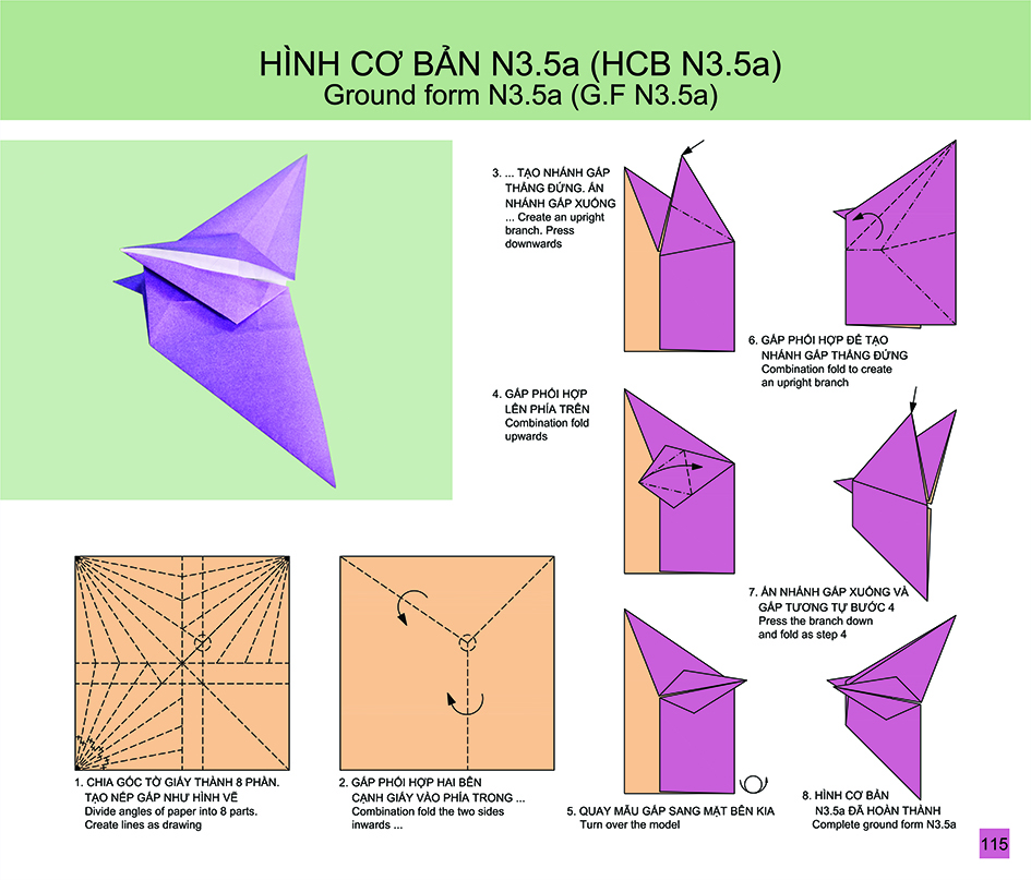 Mẫu Con cò đứng xuất phát từ Hình cơ bản N3.5a, chia góc tờ giấy thành 8 phần.