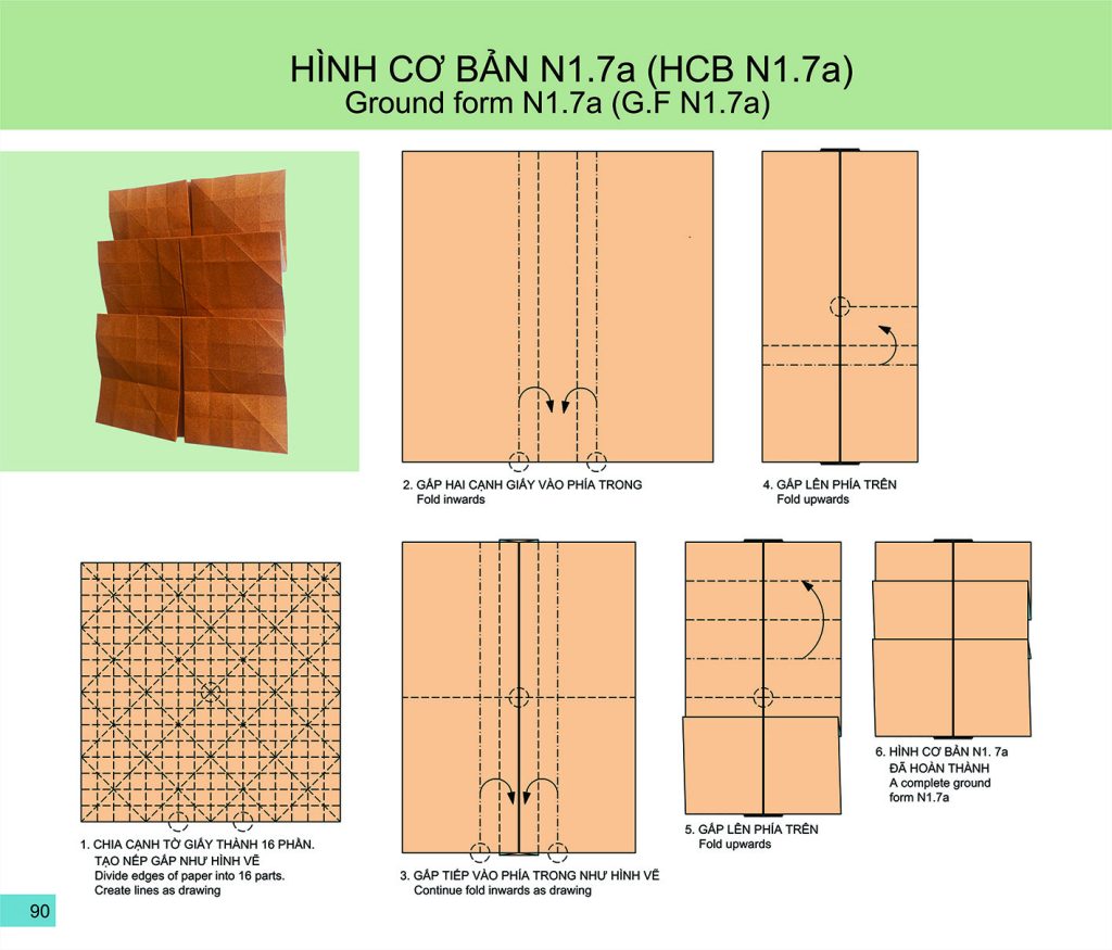 Mẫu gấp Chùa Một Cột thuộc Nhóm hình cơ bản N1.7a, chia cạnh tờ giấy thành 16 phần.
