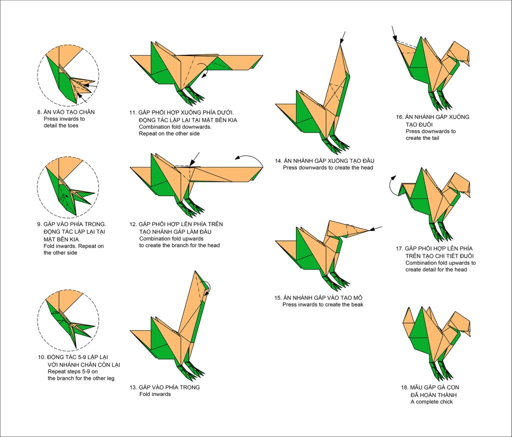 Mẫu gấp Con gà con đơn giản với 18 bước (không kể Hình cơ bản).