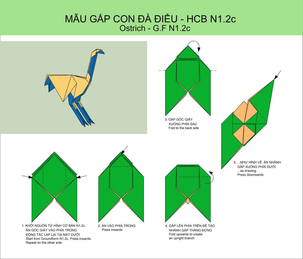 Mẫu gấp Đà điểu xuất phát từ Hình cơ bản N1.2c chia cạnh tờ giấy thành 3 phần với các nhánh gấp cho phép tạo ra hình dáng và những chi tiết của Đà điểu.