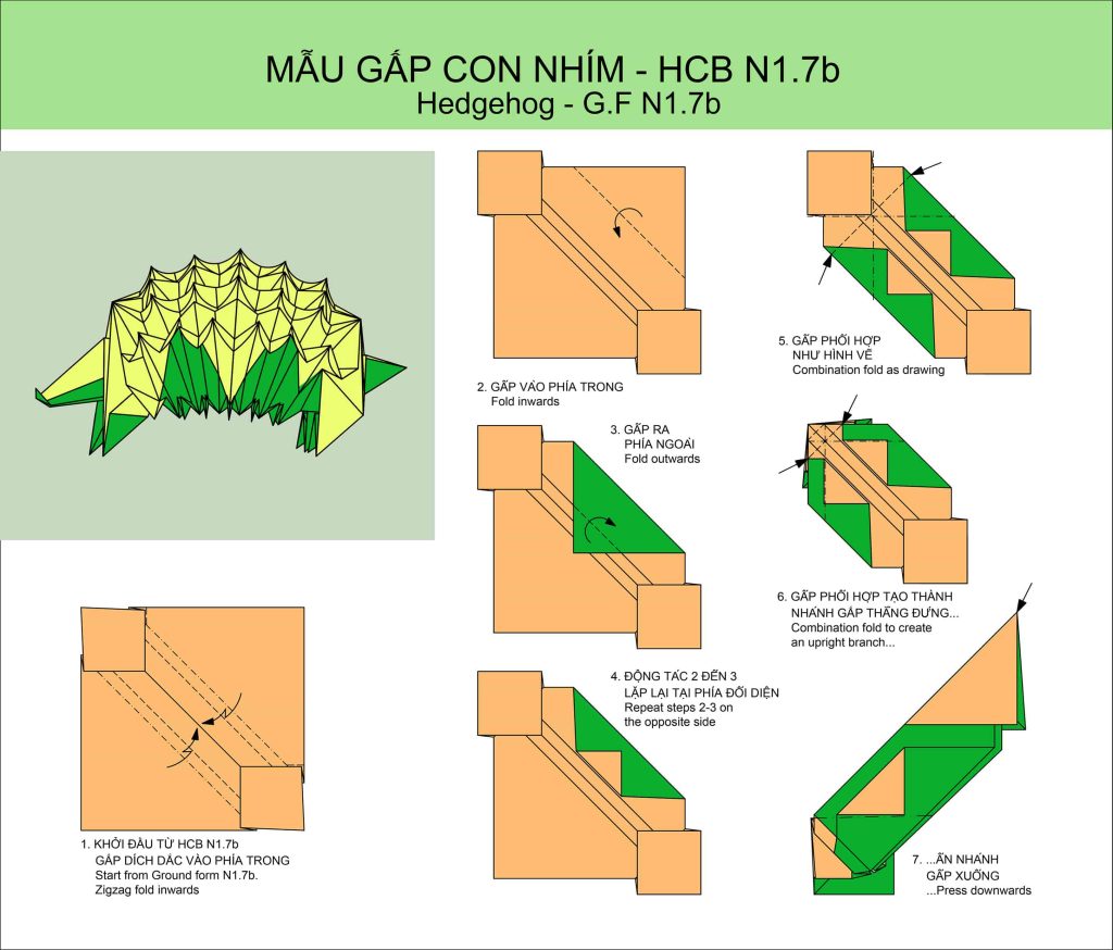 Mẫu gấp Con nhím xuất phát từ Hình cơ bản N1.7b chia cạnh tờ giấy thành 16 phần với các nhánh gấp cho phép tạo ra hình dáng và những chi tiết của con nhím.