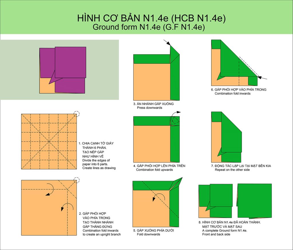 Mẫu Con gà lôi xuất phát từ Hình cơ bản N1.4e, chia cạnh tờ giấy thành 6 phần.