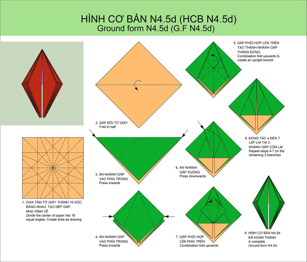Mẫu gấp Con cà cuống xuất phát từ Hình cơ bản N4.5d, chia tâm tờ giấy thành 16 góc.