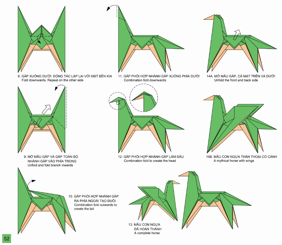 Mẫu gấp Con ngựa đơn giản với 13 bước (không kể Hình cơ bản). Mẫu gấp có thể điều chỉnh tạo thành Mẫu con ngựa có cánh.