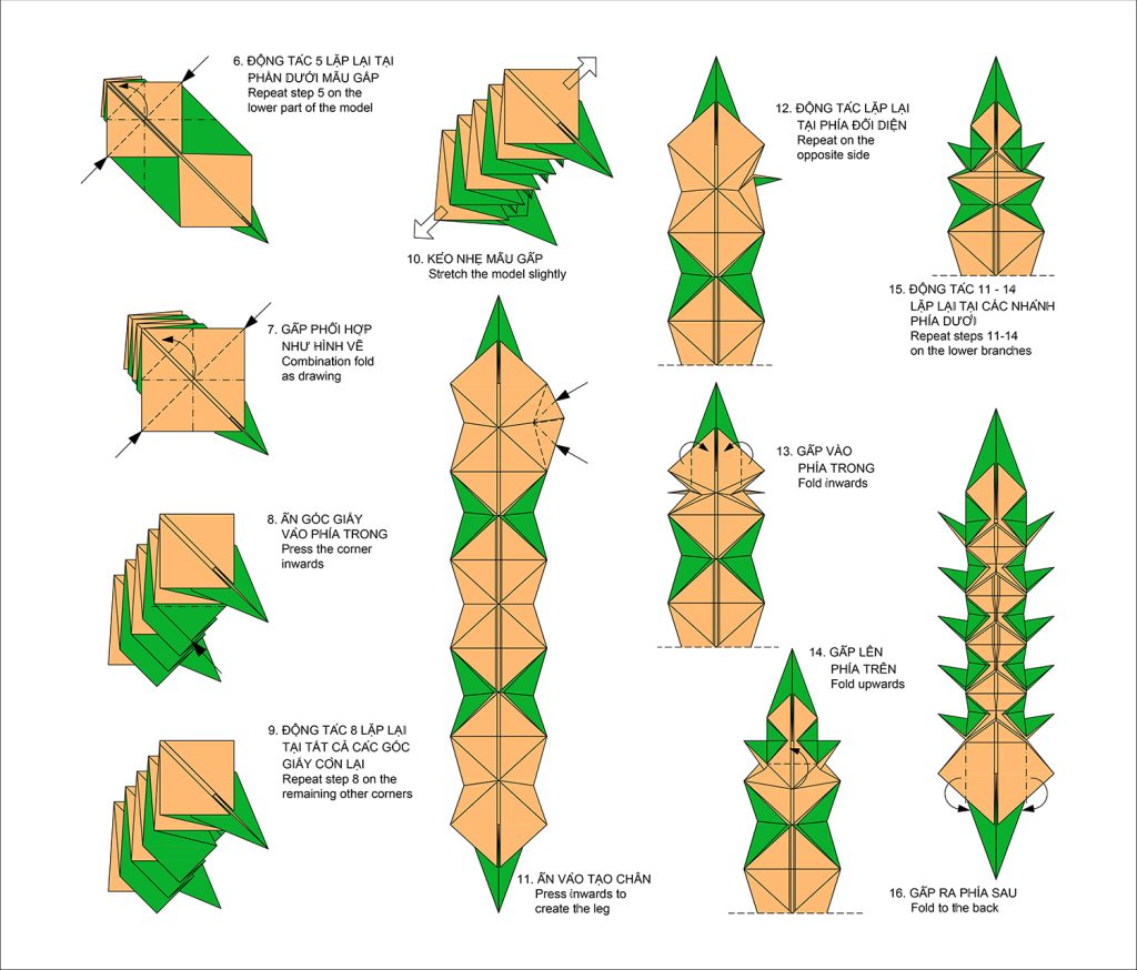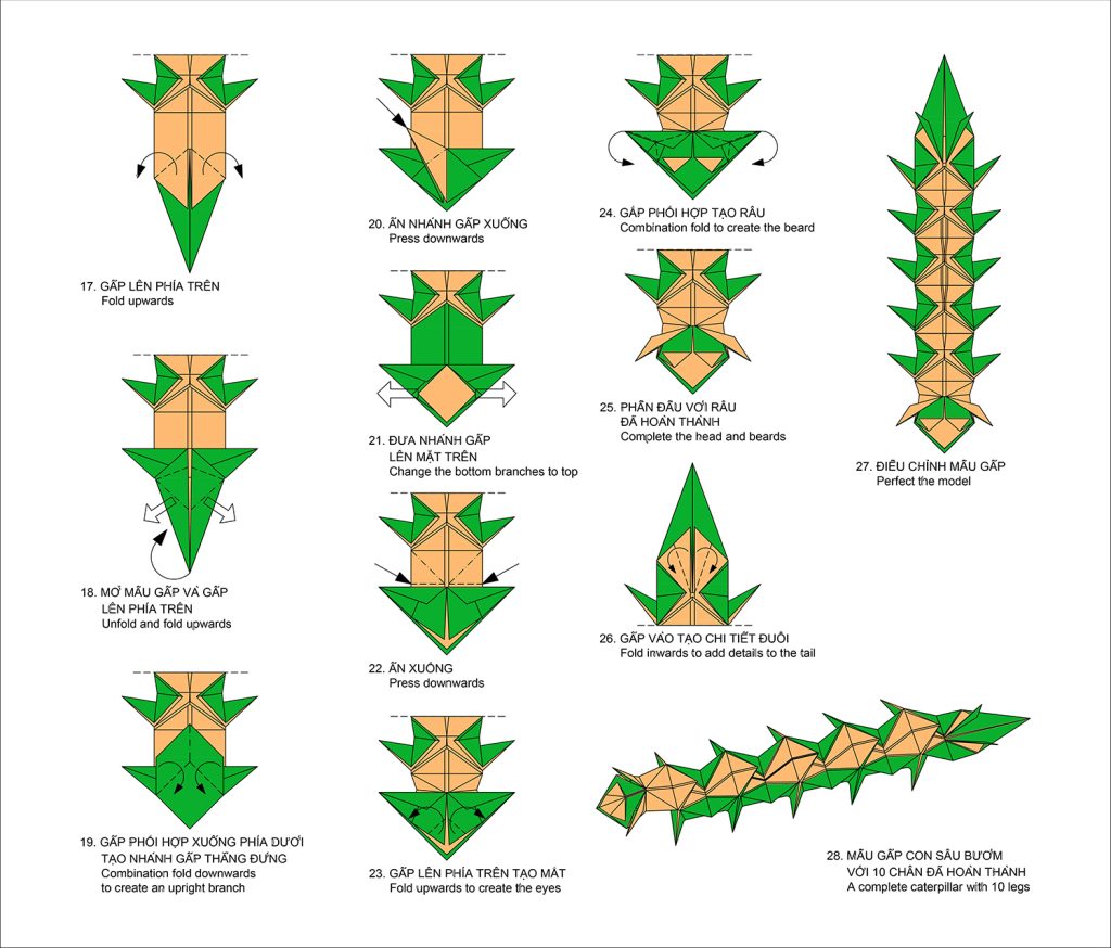 Mẫu gấp khá đơn giản với 28 bước gấp, không kể Hình cơ bản. Mẫu gấp miêu tả được biểu tượng con sâu bướm với 10 chân và các khúc thân, chi tiết đầu và đuôi,
