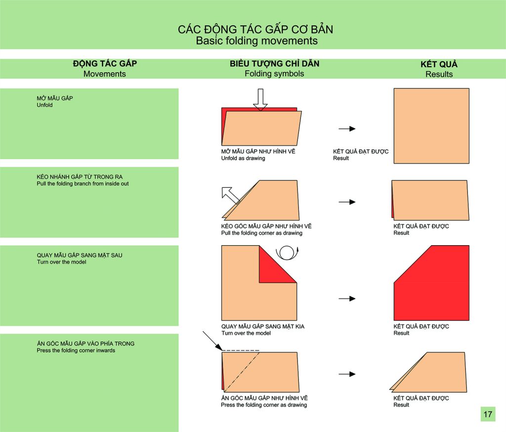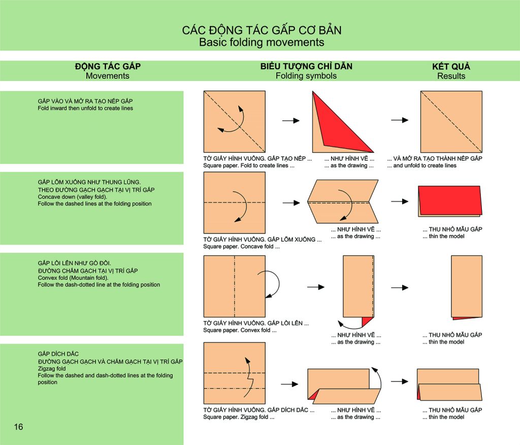 Dưới đây giới thiệu Bộ ký hiệu hướng dẫn động tác gấp và Cách gấp phối hợp.