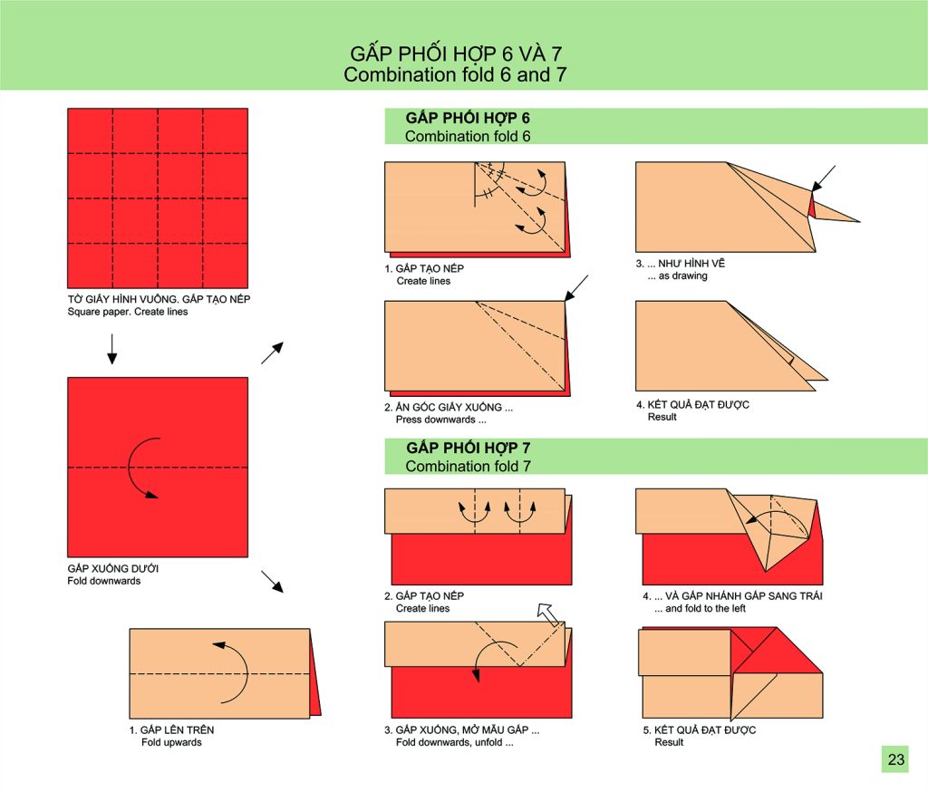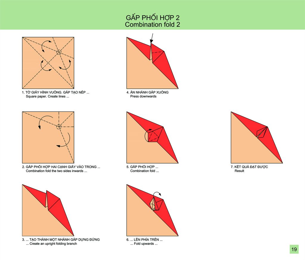 Hình ảnh các sơ đồ ký hiệu hướng dẫn động tác gấp và Cách gấp phối hợp được giới thiệu trong các cuốn sách của Nghệ nhân P. D. Tuyen.
