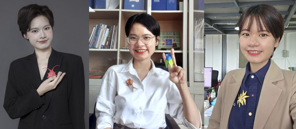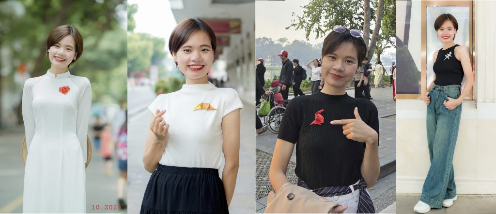 – Diệp cũng đang thử nghiệm gắn các mẫu gấp giấy lên áo làm phụ kiện đi làm, đi chơi, quay video, đi dự tiệc,… Nhiều người xung quanh ấn tượng và thường mong chờ xem hôm nay Diệp sẽ đeo phụ kiện con gì.