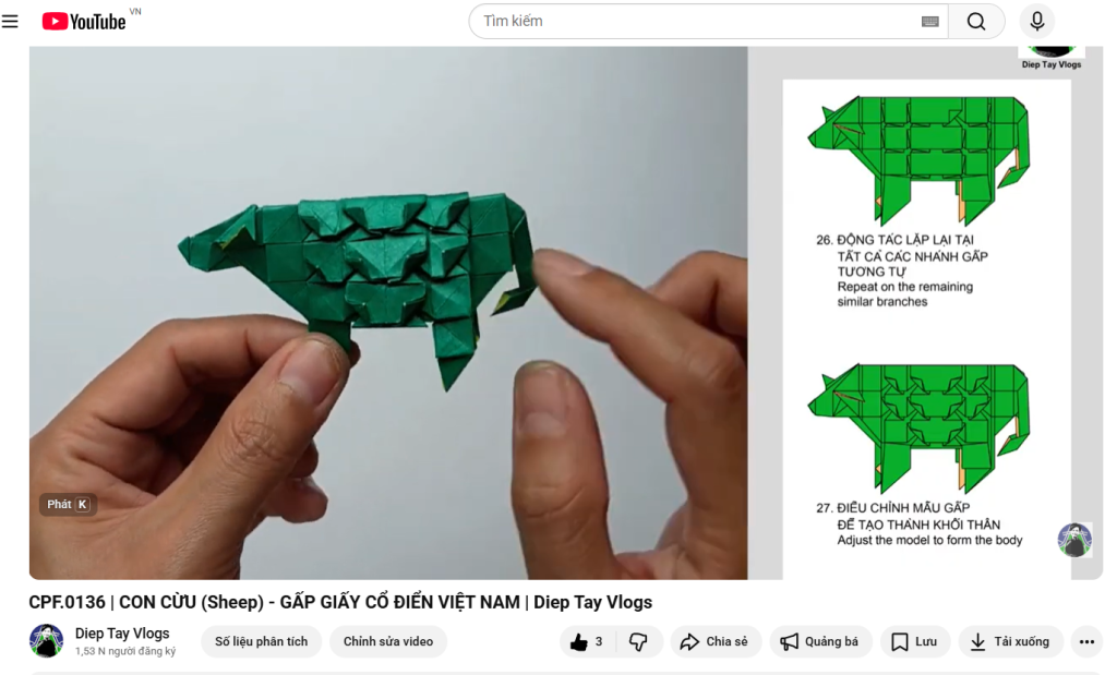– Kênh Diep Tay Vlogs và trang web dieptay.com đã giới thiệu hơn 100 mẫu gấp giấy của người Việt theo xu hướng cổ điển. Mỗi mẫu gấp đều trải qua quá trình chuẩn bị công phu để giới thiệu đến khán giả.