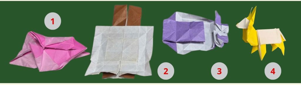 Các bước chính trong quá trình sáng tác mẫu gấp: 1. Tìm kiếm Hình cơ bản; 2. Xác lập Hình cơ bản; 3. Tạo lập mẫu gấp; 4. Mẫu gấp hoàn thành. Các hình ảnh trên được chụp ảnh tại bàn làm việc của Ông nghệ nhân trong quá trình sáng tạo Mẫu con lừa