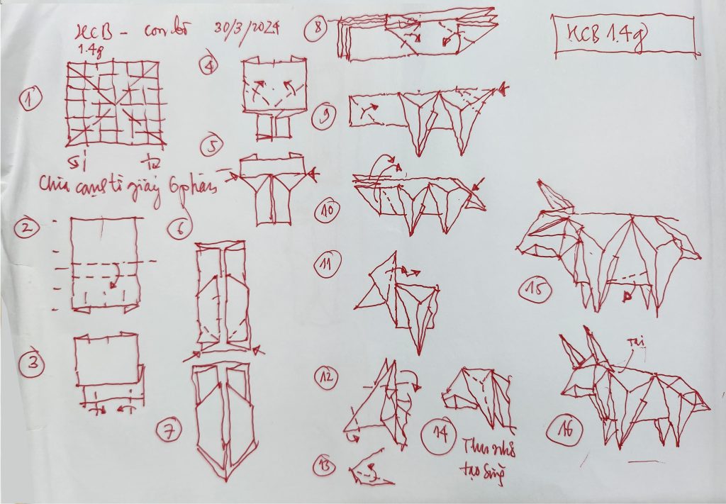 Bản phác thảo trong quá trình sáng tác mẫu gấp con bò. Phân chia động tác gấp có vai trò quan trọng, cơ sở cho việc trình bày hình vẽ hướng dẫn, thuận lợi nhất cho người tham gia gấp giấy.