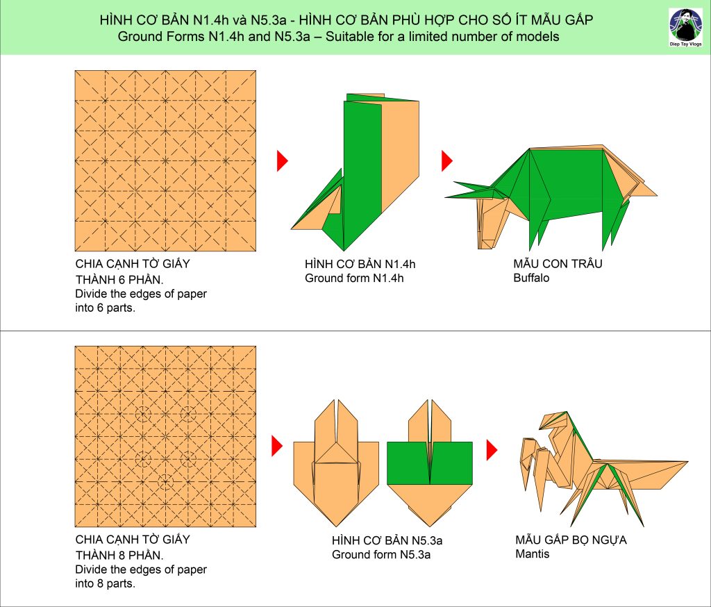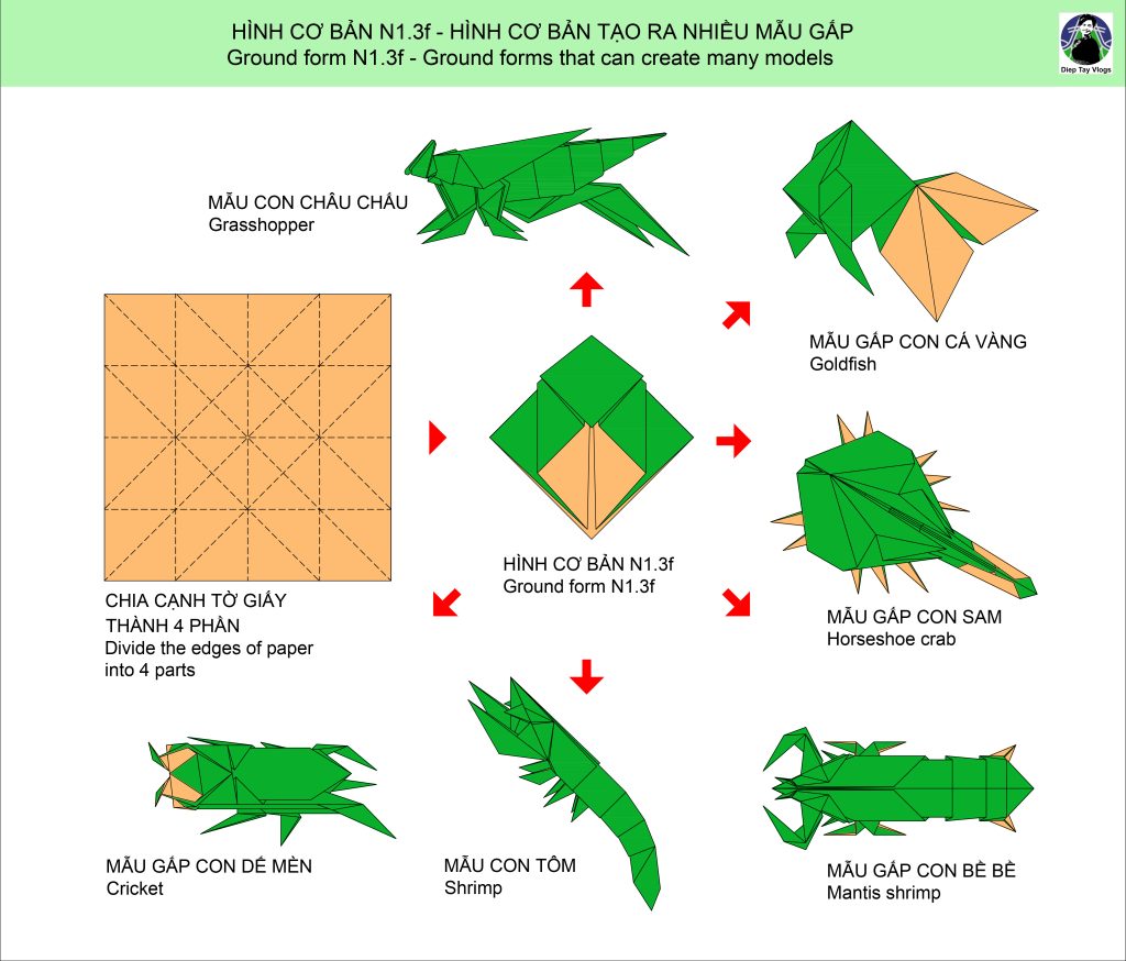 – Trong quá trình tạo Mẫu gấp giấy, có một số mẫu chung nhau những bước gấp ban đầu nhất định. Hình đạt được từ những bước chung nhau đó (khoảng 5 đến 10 bước gấp) được gọi là Hình cơ bản của những Mẫu gấp giấy ấy. Sự khác biệt giữa các Hình cơ bản chính là sự khác nhau ở những nhánh gấp, về số lượng, hình dạng và tỷ lệ nhánh gấp.