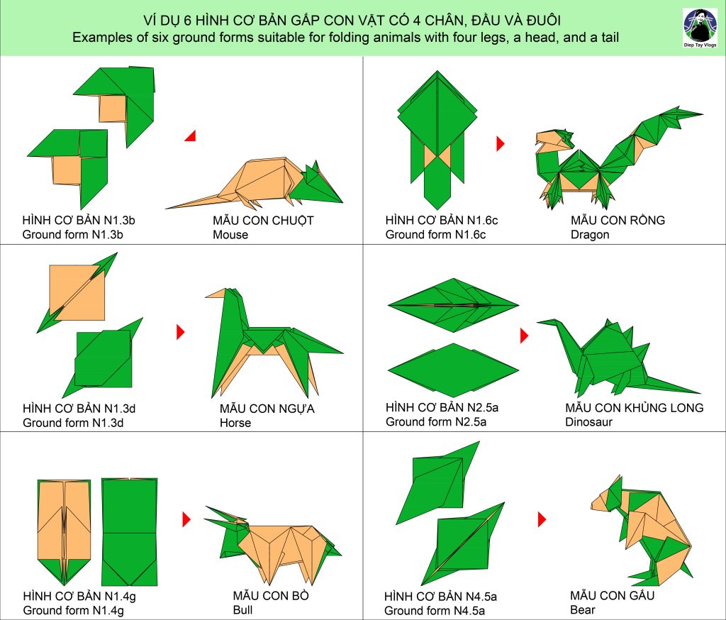 Ví dụ mộ số Hình cơ bản có 6 nhánh gấp để gấp những con vật 4 chân, đầu và đuôi.