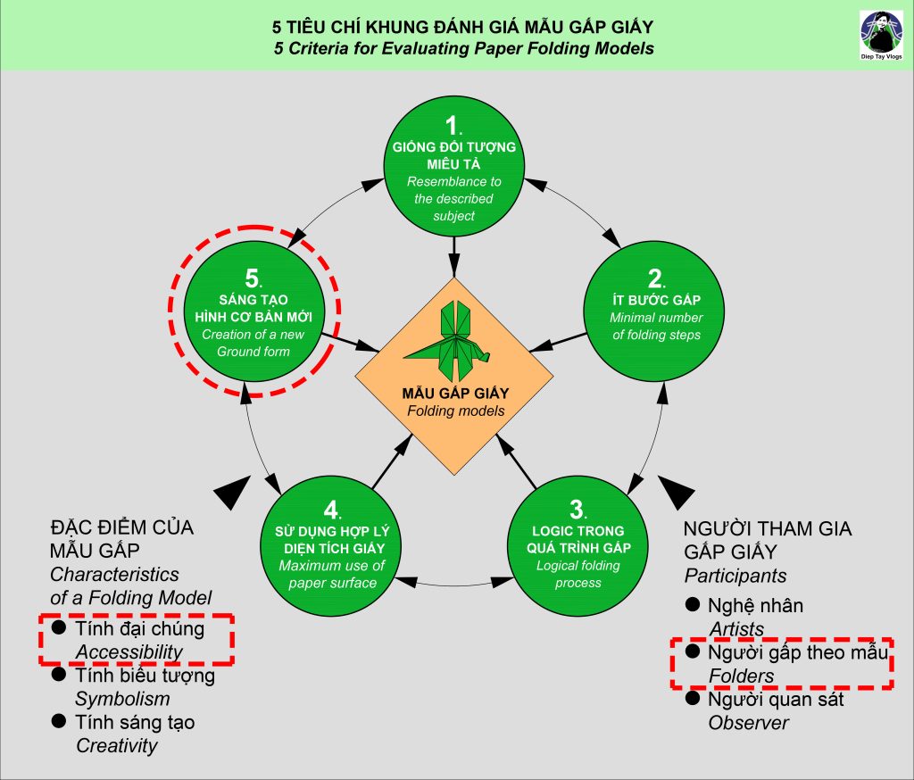 – Bộ tiêu chí đánh giá Mẫu Gấp giấy của người Việt Nam gồm 5 tiêu chí: (i) Mẫu gấp giống đối tượng miêu tả; Trước hết là các chi tiết tiêu biểu; (ii) Số lượng bước gấp; Càng ít bước gấp càng tốt. (iii) Cách gấp logic; Để ai cũng gấp theo được; (iv) Diện tích giấy được sử dụng tối đa; Gấp giấy mà không phải nặn giấy. (v) Hình cơ bản mới; Để tạo sự đặc sắc của mẫu gấp.