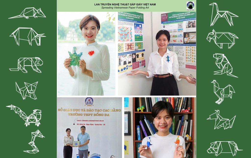 Lan truyền Nghệ thuật Gấp giấy Việt Nam; Ảnh trên bên trái: Diệp chọn Nghệ thuật Gấp giấy làm sự nghiệp lâu dài với Mẫu gấp Rùa thần tại Hồ Hoàn Kiếm, Hà Nội; Ảnh dưới bên trái: Diệp tặng sách gấp giấy cho trường cấp III nơi Diệp từng học; Ảnh trên bên phải: Diệp đang giới thiệu Nghệ thuật Gấp giấy Việt Nam trong một cuộc triển lãm; Ảnh dưới bên phải: Diệp đang trình bày mẫu gấp trong video trên Kênh Diep Tay Vlogs.