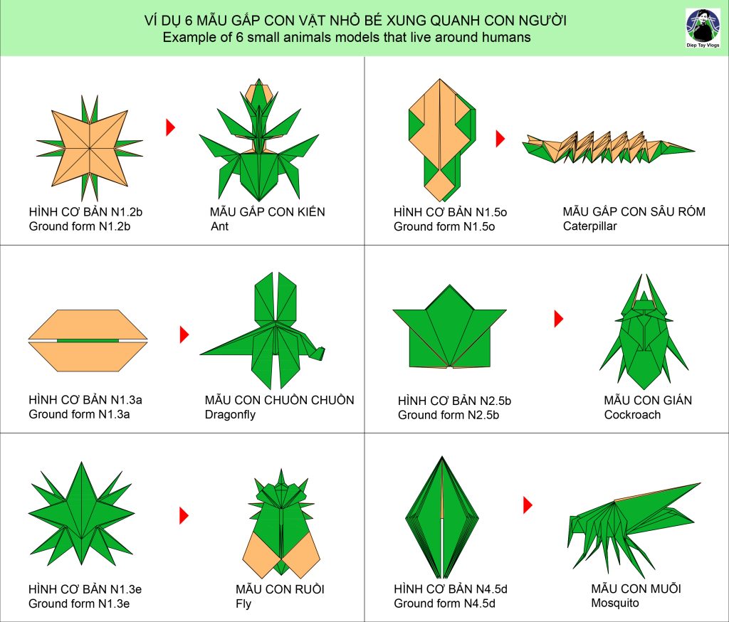 – Mẫu gấp giấy của người Việt không chỉ có mẫu gấp mang biểu tượng tốt đẹp, mẫu con vật to lớn thể hiện sức mạnh, mẫu con vật thể hiện kỹ năng của người sáng tác, mà còn có cả các mẫu gấp thể hiện sự đa dạng của tự nhiên, gần gũi với con người. Ví dụ như: Mẫu gấp con ruồi, con muỗi, con gián, con kiến,….
