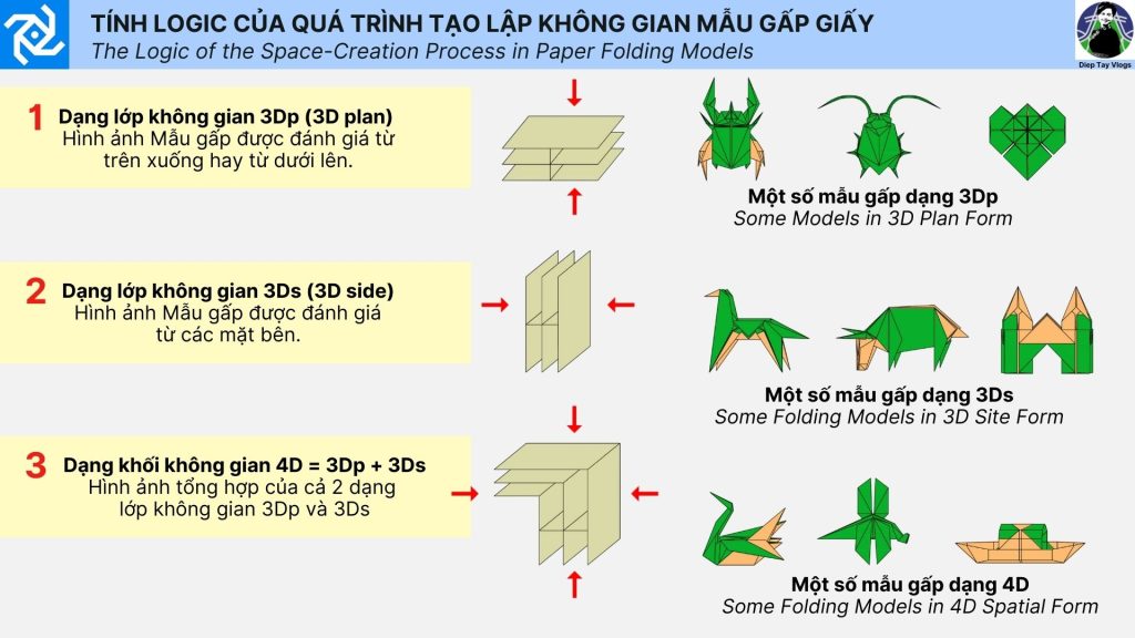 Tính logic của quá trình tạo lập không gian Mẫu gấp giấy về cơ bản gồm 3 bước: (i) Lựa chọn dạng lớp không gian 3Dp hoặc 3Ds khi xác định Hình cơ bản; (ii) Tạo lập lớp không gian này; (iii) Điều chỉnh, hướng tới dạng khối không gian 4D.