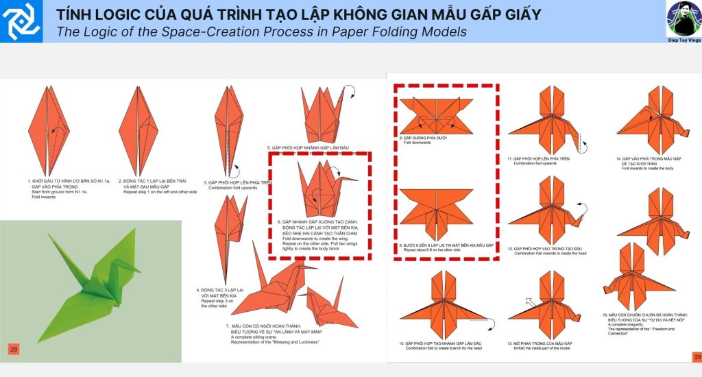Về tính logic của quá trình tạo Mẫu gấp giấy, có 3 nội dung: (i) Logic của quá trình tạo lập không gian Mẫu gấp; (ii) Logic của quá trình sắp xếp các bước gấp; (iii) Logic của kỹ thuật gấp.