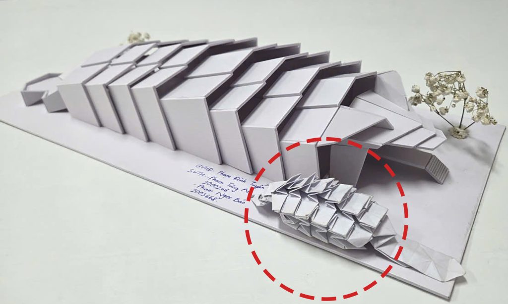 – Nhóm sinh viên khởi nguồn ý tưởng sáng tạo của đồ án từ Mẫu gấp giấy Con tê tê. Đây là mẫu gấp có cấu trúc đặc trưng là lớp vảy trên thân. Chính lớp vảy đã tạo ra cấu trúc xây dựng công trình theo xu hướng phi hình hộp.
